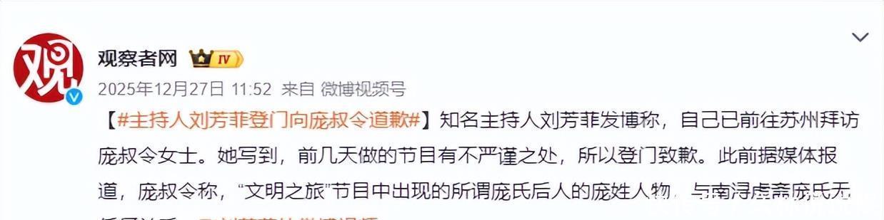 参考信息源:【1】2025年12月27日发布 官方媒体观察者网 《主持人刘芳菲登门向旁叔令道歉》但为提升文章可读性,细节可能存在润色,请理智阅读,仅供参考!